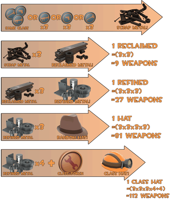 4 refined metal + 1 токен класса = 1 рандомная шапка для указанного класса (итого надо 112 предметов)