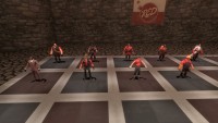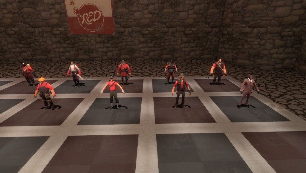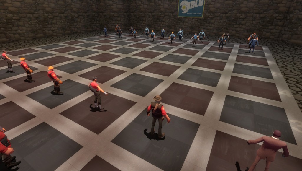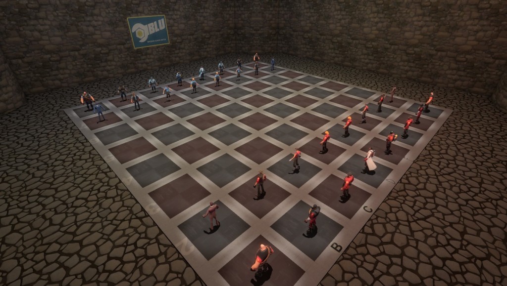 Моя идея: Пешка - Скот. Ладья - Снайпер либо хеви! Хеви тут хорош! Слон - Пиро. Конь - Демо с липучкометом... ( создается вопрос: размер клеток? Чтоб демо сам себя не убил) Король - Медик Королева - Хеви либо снайпер! Снайпер кажется лучше ! Думайте.... Или вот как! Конь пусть спай будет, и жертва будет спиной к нему поворачиваться... ну или с амбасадора будет в голову убивать.